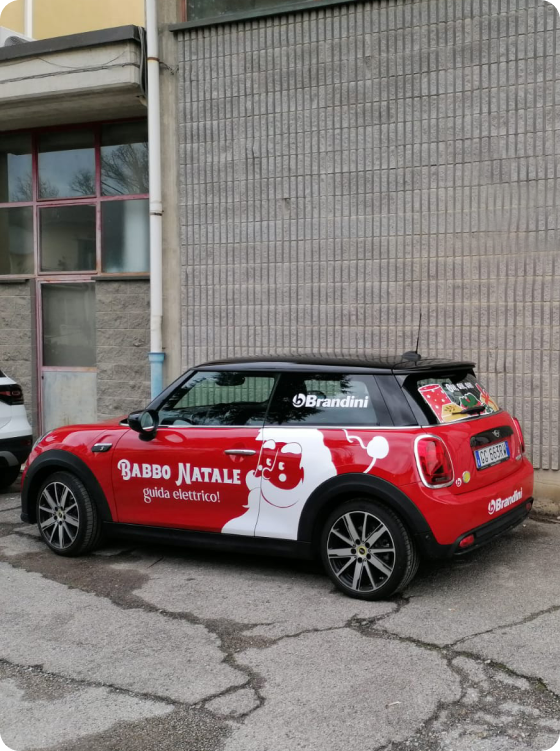 The idea was to turn the car into Santa's modern sleigh. The easily recognizable representation of Santa Claus allowed playing with the red colour of the vehicle without losing clarity in the drawing. The red pieces of Santa's clothes weren't coloured but engraved from the white decal. From the rear window, however, coloured gift packages appeared.