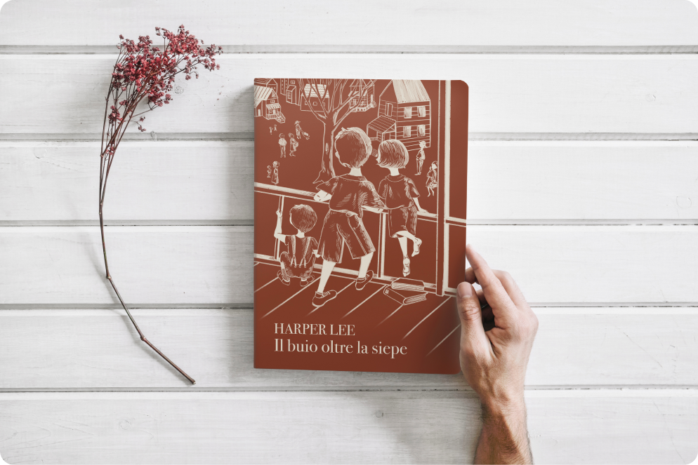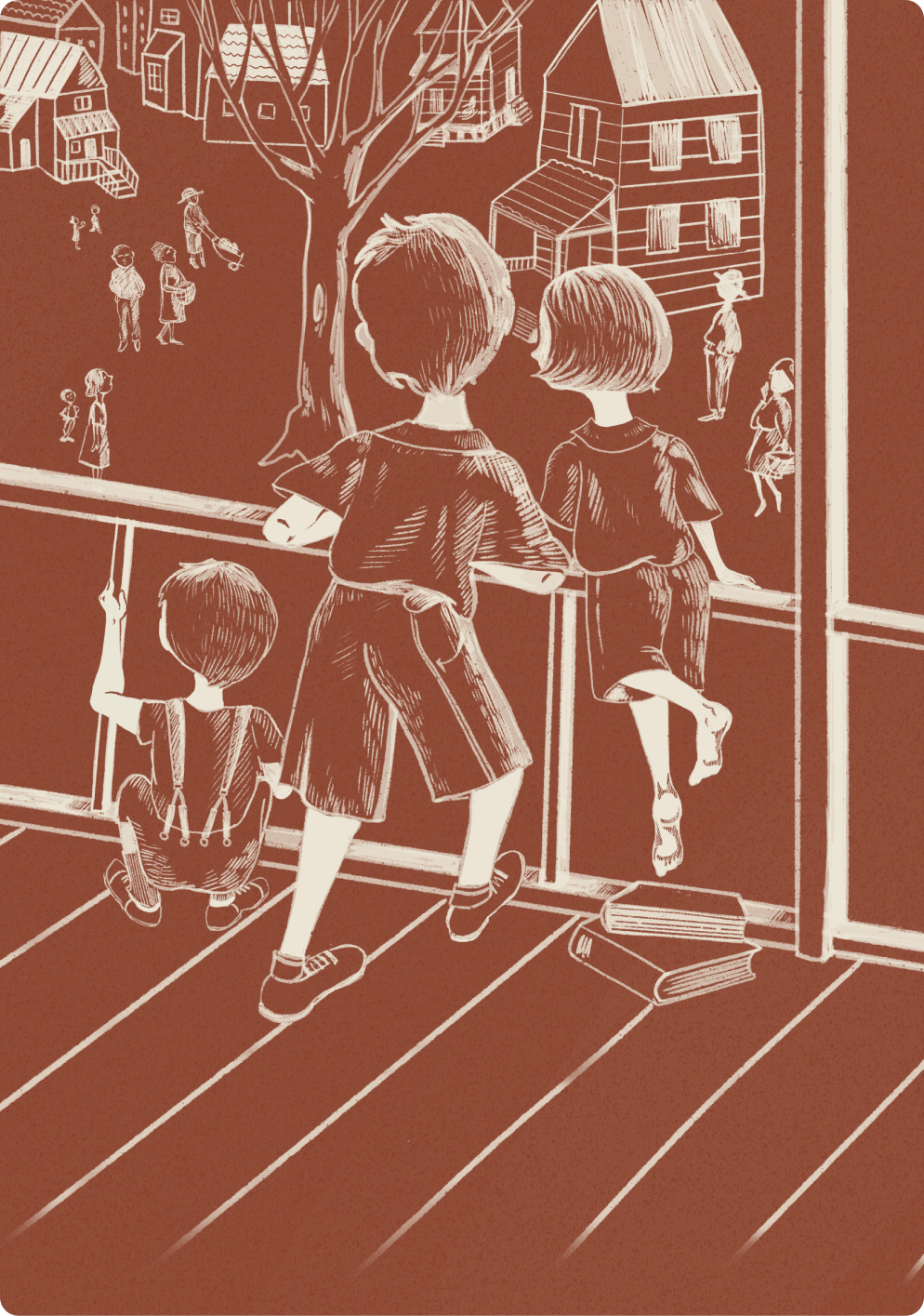 I decided to illustrate the scene from the main character's eyes, the young Scout, Atticus's daughter, in the company of her older brother and their best friend, as it happens in the novel. This illustration is a glimpse of the life in Maycomb portrayed from Scout's point of view and at the same time from the reader's point of view. The style used would simulate the engraving technique. Only a stroke so decisive can symbolize an intense story like that.